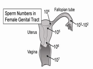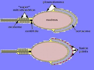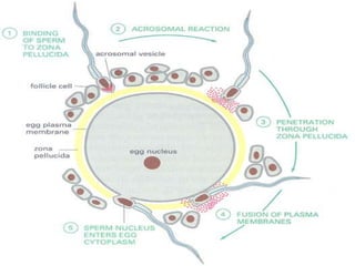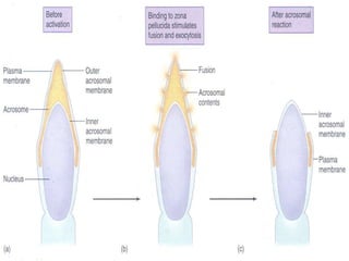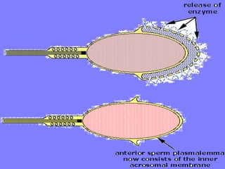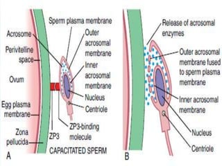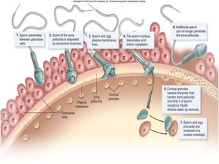 2. For fertilization to occur, sperm must navigate barriers like cervical mucus, penetrate the zona pellucida surrounding the egg, and fuse with the egg membrane. Binding of sperm to zona pellucida protein ZP3 triggers the acrosome reaction which releases enzymes to penetrate the zona.