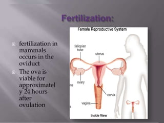 1) It describes the steps of fertilization, including capacitation, contact, acrosome reaction, fusion of sperm and egg, and activation of the ovum.