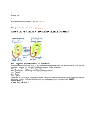The document explains the process of fertilization in plants, which involves the union of male and female gametes, leading to the formation of a zygote and endosperm through double fertilization. It details the stages of pollination, pollen tube development, and the eventual formation of seeds and fruits, highlighting the significance of these processes in plant reproduction. Additionally, it outlines the structure of ovules and pollen grains, emphasizing their roles in successful fertilization and the development of new generations.