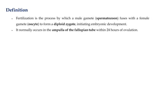 • Fertilization isthe process by which a male gamete (spermatozoon) fuses with a female