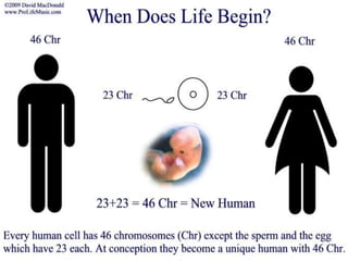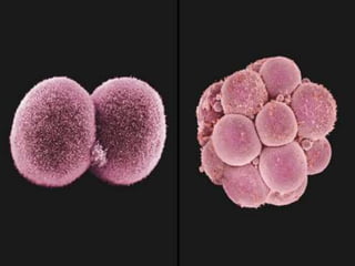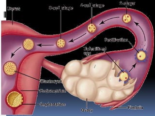 Fertilization is the process by which an egg is fertilized by a sperm, beginning the development of a new organism. It occurs in the fallopian tubes, where the sperm penetrates the egg and fuses with its pronuclei. This forms a single cell called a zygote, which undergoes rapid cell division to become a blastocyst that implants in the uterus. The blastocyst continues to develop through the stages of morula, blastocyst, and embryo as it grows over a period of 38 weeks until birth as a full-term baby.