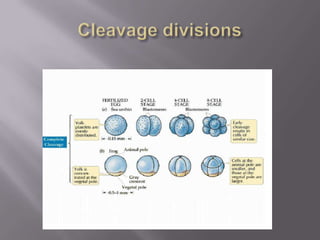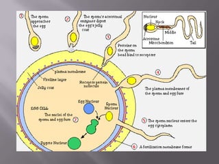 Fertilization involves the fusion of male and female gametes to form a zygote, which triggers embryonic development. Several key steps occur, including capacitation of sperm as they travel through the female reproductive tract, the acrosome reaction that allows sperm to penetrate the zona pellucida surrounding the egg, and fusion of the male and female pronuclei inside the egg. This activation of the egg prevents polyspermy and leads to the first cell divisions and formation of a multicellular embryo through cleavage, blastulation and gastrulation.