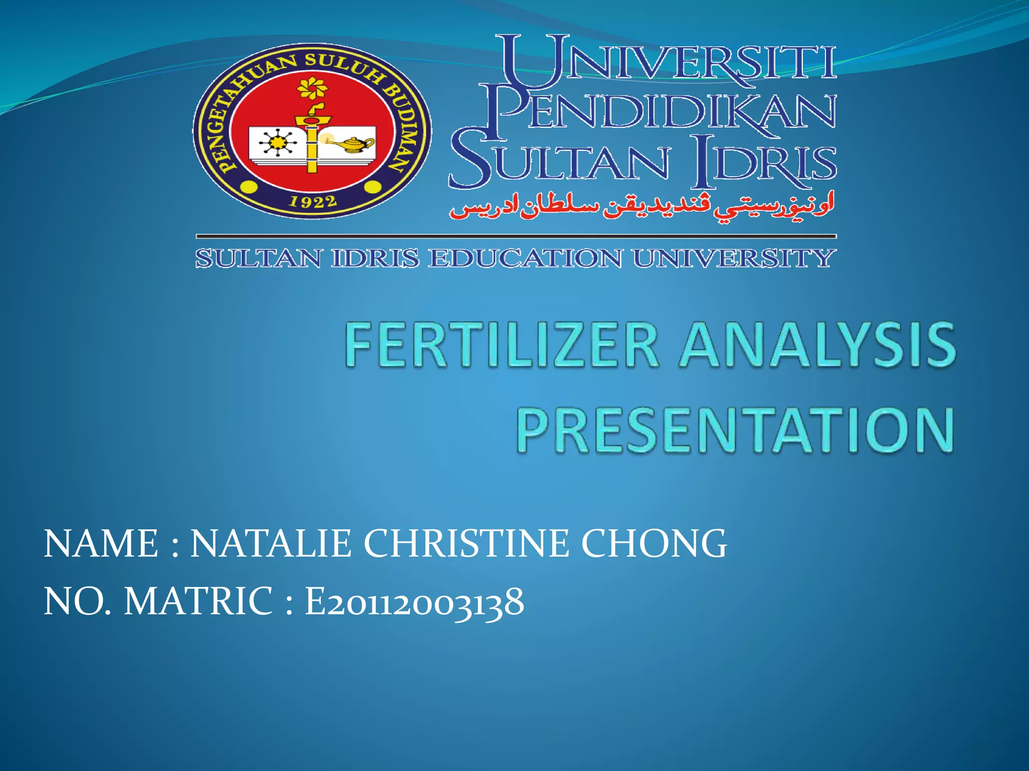This document discusses types of fertilizers and their analysis. It identifies three main types of fertilizers - solitary fertilizers which contain a single nutrient, compound fertilizers which contain two or more nutrients through chemical processing, and mixture fertilizers which also contain multiple nutrients but are mixed without chemical processing. It then lists examples of common fertilizers and their purposes. The document outlines several methods for analyzing fertilizers including atomic absorption spectroscopy, inductively coupled plasma, flame photometry, and Buchi distillation to test for nutrients like nitrogen, potassium, magnesium, phosphorus, and boron. It provides steps for sample preparation including grinding, weighing, adding water and acids, heating, filtering, and transferring solutions for instrumental analysis by ICP or