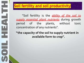 Fertilizers are any materials added to soil to supply plant nutrients. They are classified as straight, complex, or mixed. Straight fertilizers contain one primary nutrient like urea (nitrogen), while complex contain two or three like ammonium phosphate (nitrogen and phosphorus). Mixed fertilizers are physical mixtures of straight fertilizers containing two or three primary nutrients. Fertilizers can also be complete or incomplete depending on whether they contain all three major nutrients: nitrogen, phosphorus, and potassium.