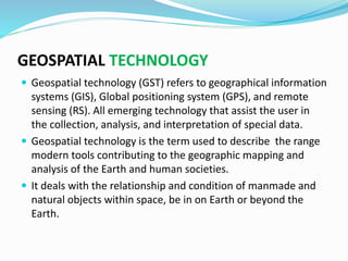The document discusses the use of geospatial technology (GST) in agriculture for improving fertilizer recommendations, which includes tools such as GIS, GPS, and remote sensing. GST enhances crop yield, resource management, and environmental sustainability by providing data for optimized fertilizer application. The report outlines objectives for creating variable rate maps and emphasizes the importance of accurate soil sampling and yield goals for effective fertilizer management.