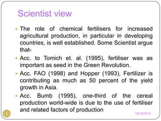 The document discusses India's chemical fertilizer industry and consumption trends. It notes that India is the third largest producer and second largest consumer of chemical fertilizers globally. While domestic production meets some of the demand, India still imports significant quantities of urea and DAP each year to meet consumption needs. The use of chemical fertilizers has increased dramatically over time and supported rising food grain production in the country.