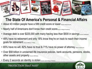 - The document then describes a company called Financial Education Services that provides financial education and services to help protect people's identities, credit, finances, families, lifestyles and futures.
