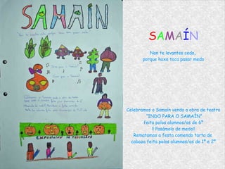 S A MA Í N Non te levantes cedo, porque hoxe toca pasar medo Celebramos o Samaín vendo a obra de teatro “ INDO PARA O SAMAÍN” feita polos alumnos/as de 6º !! Pasámolo de medo!! Rematamos a festa comendo tarta de cabaza feita polos alumnos/as de 1º e 2º