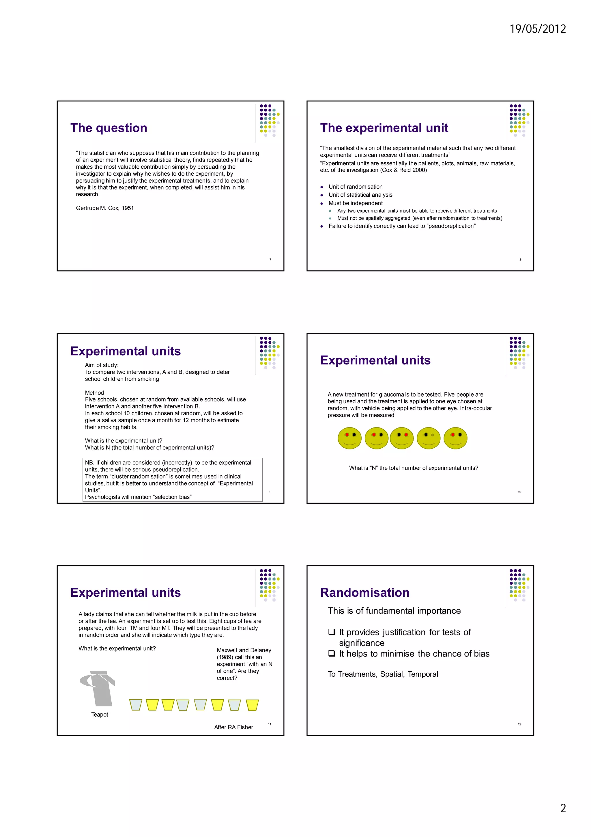 2. Randomisation and blinding are important to reduce bias. The experimental unit must also be correctly identified.
