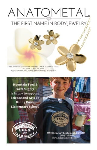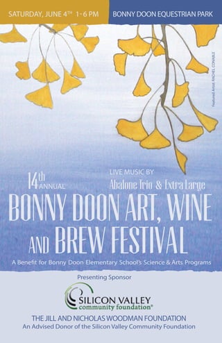 This document provides information about the 14th Annual Bonny Doon Art, Wine and Brew Festival including the date, location, featured artist, schedule of events, auction items, sponsors and more. The festival is a fundraiser that supports the science and arts programs at Bonny Doon Elementary School and will take place on June 4th from 1-6pm at the Bonny Doon Equestrian Park featuring live music, auctions, food, drinks and family activities.