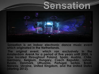 Sensation is an electronic dance music festival that originated in the Netherlands and has expanded to locations throughout Europe and the Americas. It focuses on house and harder styles of music under separate Sensation Black and Sensation White events. Other festivals mentioned include Etnosur in Spain, Creamfields in the UK, festivals in Edinburgh, Tomorrowland in Belgium, Awakenings in the Netherlands, Woodstock in 1969, and Love Parade in Germany. Rock in Rio is held in Brazil, Portugal, Spain and will expand to Argentina, while Monegros Desert Festival and Mundo Evassion are electronic music festivals held in Spain.