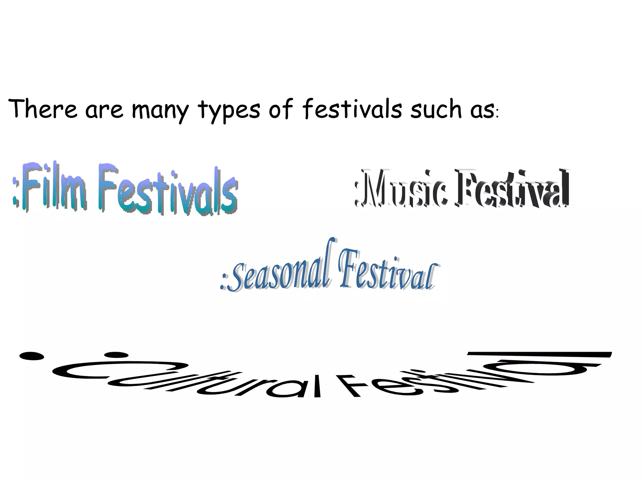 Festivals are events that celebrate unique aspects of local communities and come in many forms. Film festivals showcase recent films, both domestic and international, in movie theaters over an extended period, often focusing on specific genres or directors. Music festivals feature live musical performances across various genres and include other attractions. Seasonal festivals mark the changing seasons and their effects on agriculture and food supply through the year. Cultural festivals celebrate traditions of ethnic groups.