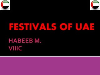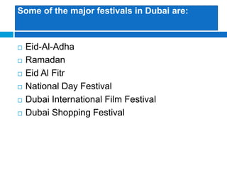 The major festivals in Dubai include Eid-Al-Adha, Ramadan, Eid Al Fitr, National Day Festival, Dubai International Film Festival, and Dubai Shopping Festival. Eid-Al-Adha is a three day celebration that commemorates Prophet Ibrahim's willingness to sacrifice his son and marks the end of the Hajj pilgrimage. Ramadan is the month of fasting where bars are closed and public eating and drinking are prohibited. Eid Al Fitr is a three day feast after one month of Ramadan involving prayers, gifts, and celebrations. National Day is celebrated annually on December 2nd to mark Dubai's independence from Britain.