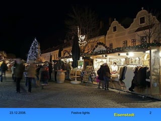 The document describes photographs taken in late 2008 of festive lights in locations in western Hungary, Burgenland, and Lower Austria, including Eisenstadt and its Esterhazy Castle, Sopron, and Baden. It also mentions photographs taken in Wiener Neustadt. The document provides links to view additional parts of the photo presentation online.