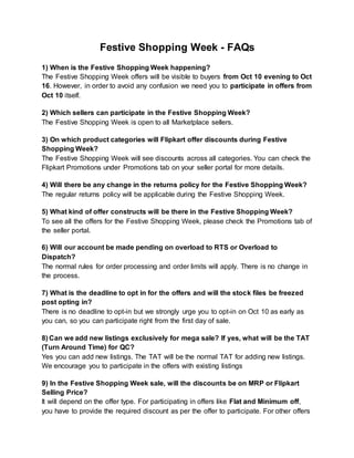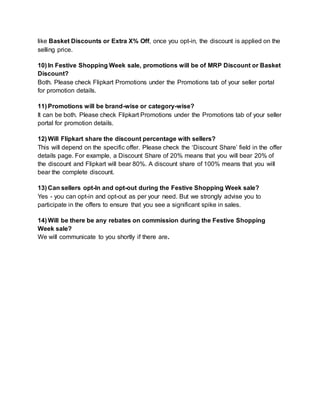 The Festive Shopping Week will take place from October 10th to October 16th. All marketplace sellers can participate in discounts across all categories. Sellers are encouraged to opt-in to offers by October 10th under the Promotions tab to receive discounts on their selling prices and participate in the sales event. Discounts can include flat rates, minimum amounts, basket discounts, and extra percentages off. Further offer details will be provided to sellers.