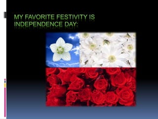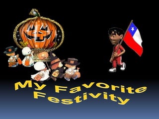 This document discusses the favorite festivities of Independence Day and Halloween. For Independence Day, the author eats empanadas and barbeque and goes to fondas in Playa Ancha or Viña del Mar, listening to typical music and dancing cueca while wearing typical Chilean clothing. For Halloween, the author eats candies, wears costumes, and has fun playing trick or treat by going to other houses to ask for candies. Special elements of each holiday are also listed.