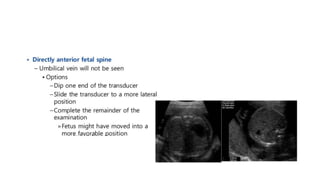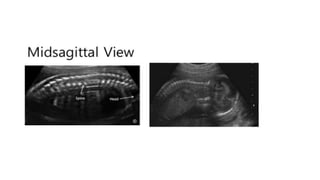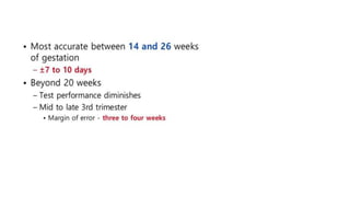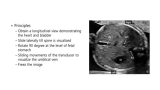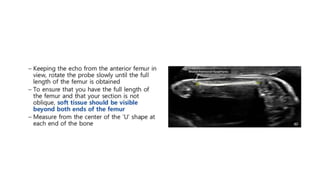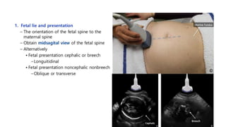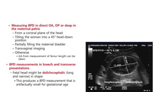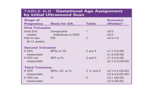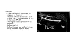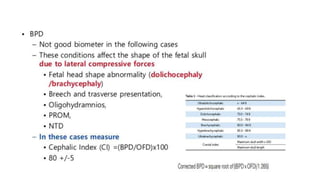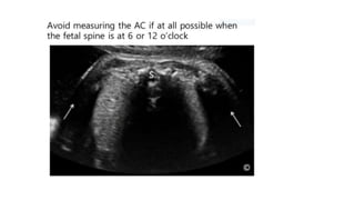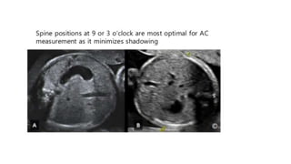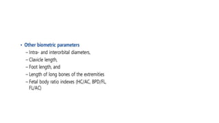 Fetal biometry parameters are ultrasound measurements used to indirectly assess fetal growth and well-being, including biparietal diameter, head circumference, abdominal circumference, and femoral length. These measurements are used in formulas to estimate gestational age and fetal weight. Intrauterine growth restriction is defined as a birth weight below the 10th percentile for gestational age and can be symmetrical, affecting overall growth, or asymmetrical, primarily impacting abdominal growth. Ultrasound biometry, particularly abdominal circumference, allows accurate prenatal diagnosis of growth issues.