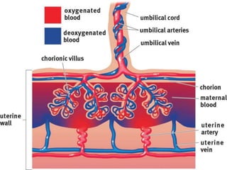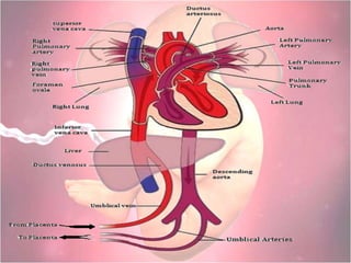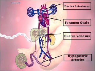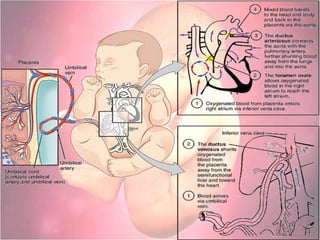 The fetal circulation allows oxygen and nutrients to pass from the mother's blood to the fetus via the placenta and umbilical cord. Blood from the fetal heart is shunted away from the lungs through the ductus arteriosus and returns to the aorta. The placenta connects the fetus to the uterine wall, allowing nutrient/gas exchange and waste elimination via the mother's blood supply. The fetal circulation has special structures like the foramen ovale and ductus arteriosus that ensure blood bypassing the lungs reaches the body. After birth, changes in blood flow and pressure cause these structures to close as the lungs become functional.
