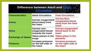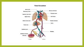 The document summarizes fetal circulation during pregnancy and at birth. During pregnancy, the placenta functions as the lungs and exchanges gases. The umbilical cord connects the fetus to the placenta, carrying oxygenated blood, nutrients to the fetus and deoxygenated blood, waste products back. In the fetus, blood circulation bypasses the nonfunctional lungs and liver through special openings called shunts. At birth, with the first breath the lungs inflate and the ductus arteriosus and foramen ovale close, establishing adult-like circulation.