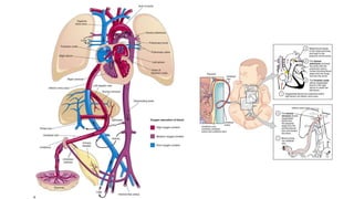 This document discusses fetal circulation and fetal echocardiography. It describes the normal Doppler waveform patterns seen in the umbilical artery, umbilical vein, ductus venosus and middle cerebral artery. It provides gestational age-based reference values for Doppler indices in the umbilical artery. The use of the cerebroplacental ratio as a marker of fetal wellbeing is also described. Measurement techniques and interpretation of Doppler studies of the middle cerebral artery and cerebroplacental ratio are covered.