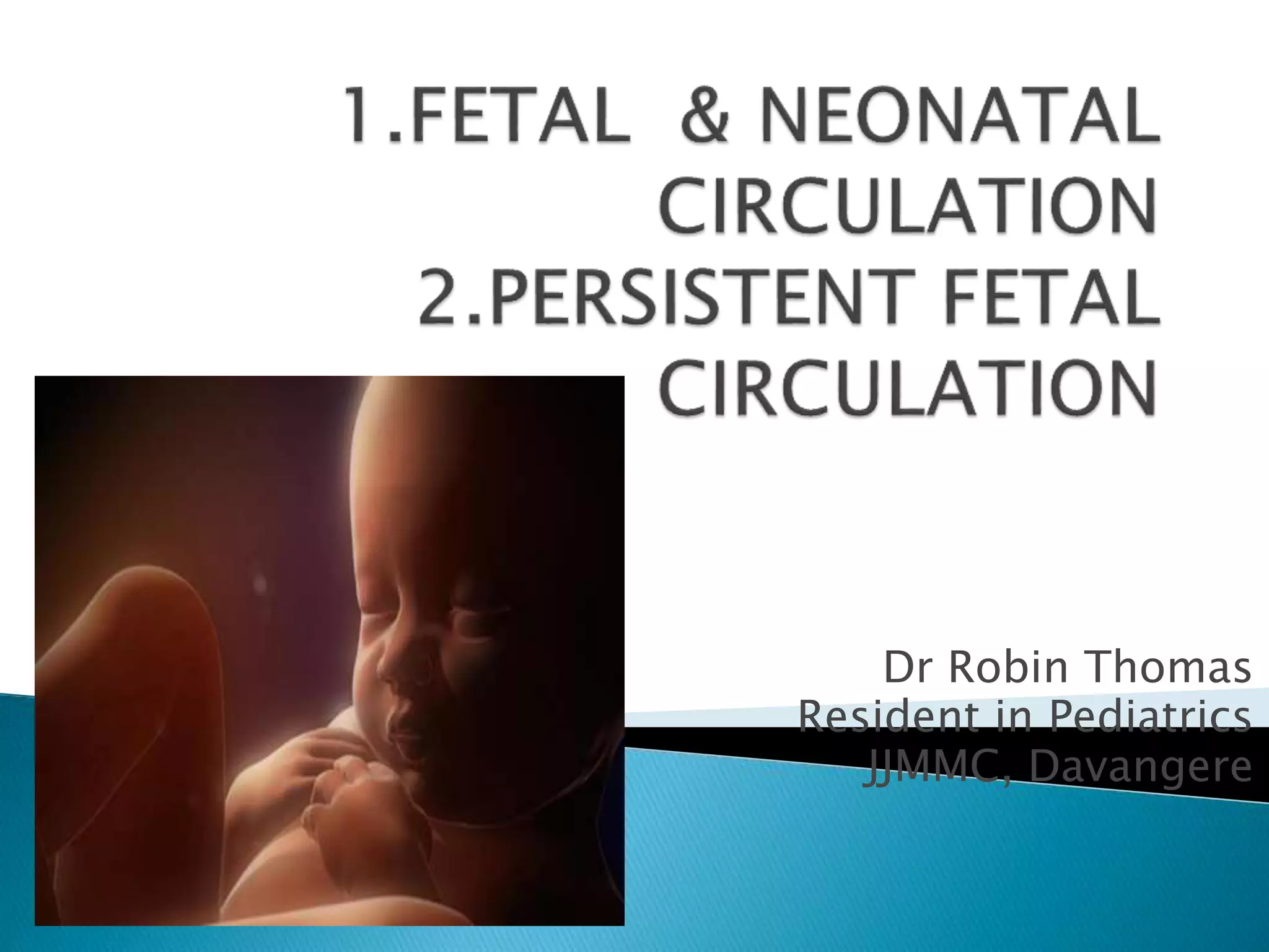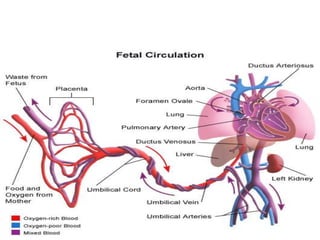 The document describes the fetal circulation and changes that occur at birth. In the fetus, oxygenated blood from the placenta travels to the heart and body while bypassing the lungs. At birth, the onset of breathing causes pulmonary vascular resistance to decrease and systemic resistance to increase. This results in blood shunting to the lungs, closure of the ductus arteriosus, and closure of the foramen ovale. The umbilical vessels also close, completing the transition to extrauterine life.
