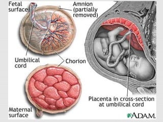 The fetal circulation allows the fetus to receive oxygen and nutrients from the placenta while bypassing the non-functional lungs. Oxygenated blood travels from the placenta through the umbilical vein to the inferior vena cava and then through the foramen ovale into the left atrium of the heart. It is then pumped through the aorta to deliver oxygen to tissues before returning to the right atrium. A small amount of blood passes through the ductus arteriosus and pulmonary arteries to the developing lungs, while most blood is shunted away from the lungs and back to the aorta. At birth, the foramen ovale and ductus arteriosus normally close as the lungs begin functioning
