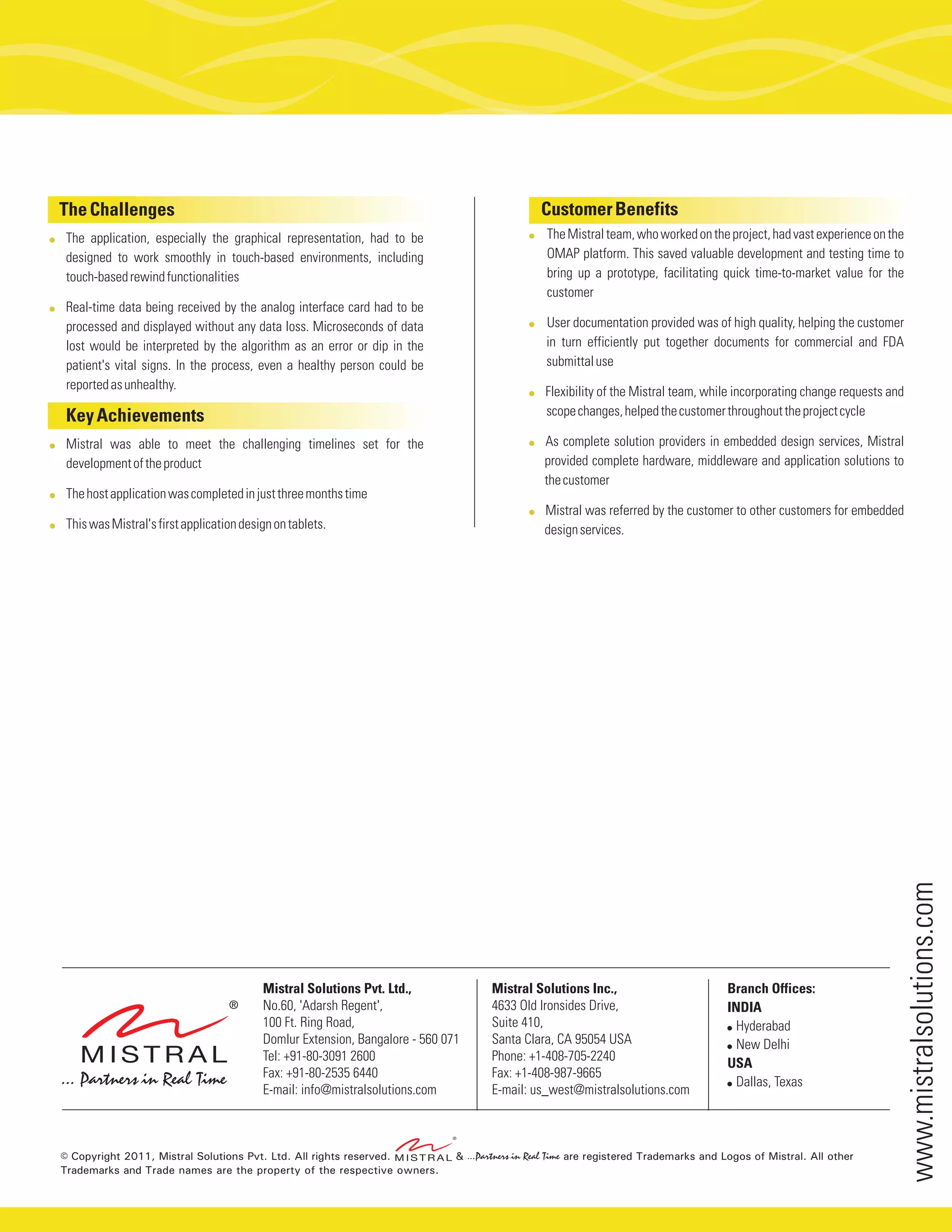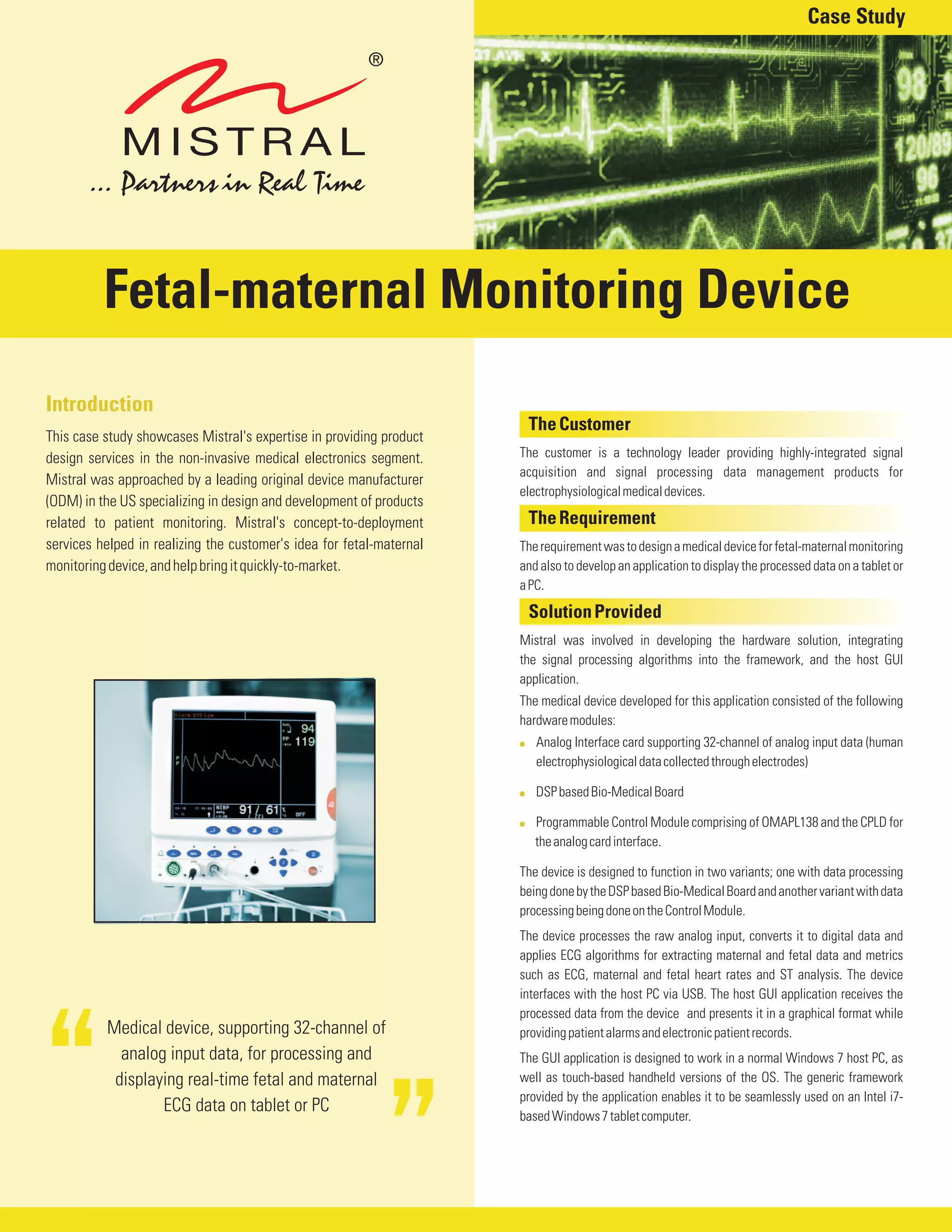Mistral Solutions developed a medical device for fetal-maternal monitoring that supports 32-channel analog input data and processes real-time ECG data for display on tablets and PCs. The project involved creating both the hardware and a graphical user interface application that operates seamlessly on various systems, ensuring data processing without loss. Mistral successfully met tight timelines, delivering the solution in three months and enhancing the customer’s ability to submit documents for commercial and FDA approvals.