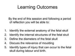 The document discusses the anatomy of the fetal skull. It describes the bones, sutures, fontanelles and regions of the skull. It outlines the ossification process and diameters used to measure the skull. Moulding is explained as the overlapping of skull bones during birth to decrease diameters. Potential injuries like caput succedaneum and cephalhematoma are also summarized.