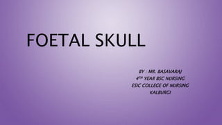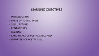 This document discusses the fetal skull, including its parts, sutures, fontanelles, regions, landmarks, and diameters. The fetal skull has three main parts - the vault of cranium, face, and base. It is made up of several flat bones joined by sutures, which allow movement during birth. The skull has fontanelles that are membranous areas where sutures meet. The skull's regions include the occiput, vertex, sinciput, and face. Its diameters and landmarks help assess proper adaptation for birth. Understanding the fetal skull is important for evaluating labor progression and detecting any complications.