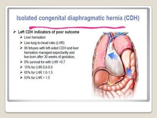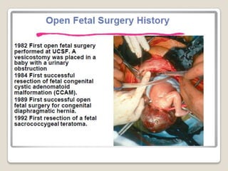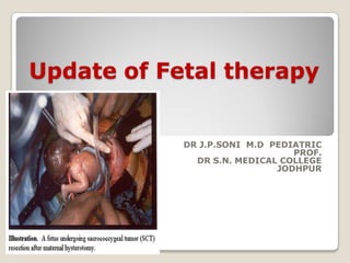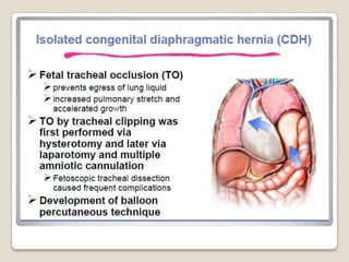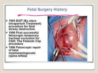 This document provides an overview of perinatology and fetal therapy. It discusses various pharmacological and surgical fetal therapies used to treat conditions such as cardiac arrhythmias, complete atrioventricular block, congenital adrenal hyperplasia, fetal anemia, twin-twin transfusion syndrome, congenital diaphragmatic hernia, and pleural effusions. Invasive fetal therapies discussed include intrauterine blood transfusion, fetoscopy, laser coagulation of vessels, and intra-amniotic gene transfer. Fetal therapy requires a multidisciplinary team and tools such as ultrasound, MRI, and fetoscopes to properly diagnose and treat conditions in-utero.