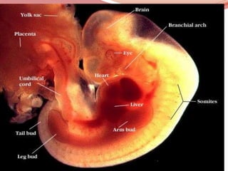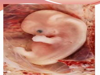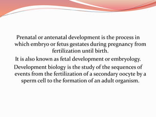 Prenatal or antenatal development refers to the process of development of an embryo or fetus during pregnancy from fertilization until birth. It involves three main periods - the pre-embryonic period from fertilization to implantation, the embryonic period from implantation to 8 weeks, and the fetal period from 9 weeks until birth. During these periods, the zygote undergoes cell division and differentiation and all major body systems and structures are developed, though they continue growing and maturing throughout pregnancy.