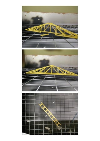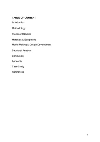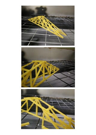 The document discusses the design and construction of a fettuccine truss bridge with a clear span of 350mm and weight limit of 180g by a group of 7 students. It includes sections on precedent studies of truss bridges, material testing and selection, structural analysis, model making methodology, and efficiency calculations. The goal is to design a truss bridge with high aesthetic value, minimal materials, and understanding of load distribution and tension/compression members in a truss.