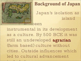The document provides background information on the history and culture of feudal Japan. It discusses how Japan developed from an undeveloped agrarian culture in 500 BCE to establishing a feudal system between 1000-1200 CE. Key developments included the influence of Chinese culture, the arrival of Buddhism, and the rise of the samurai warrior class. The samurai developed a code of honor known as Bushido that emphasized skills, discipline, bravery and loyalty to their lords. Shinto and Buddhism also played important religious roles during this period in Japan.