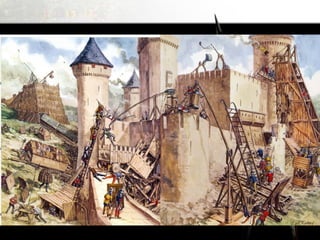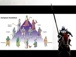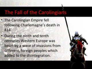 The document summarizes the development of feudalism in medieval Europe following the fall of the Carolingian Empire. Invaders like the Vikings, Saracens, and Magyars attacked Europe in the 9th-10th centuries as central authority declined. People turned to local nobles for protection, leading to a system where nobles granted land to vassals in exchange for military service. This new political and social system was called feudalism. Feudalism structured society into nobles, clergy, and peasants and was characterized by relationships of loyalty between lords and vassals.