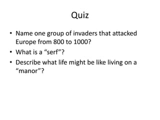 The document summarizes the rise of feudalism in Europe following invasions from the Vikings, Magyars, and Muslims between 800-1000 AD. It explains that as kings were unable to provide protection, people looked to local rulers who granted land (fiefs) to vassals in exchange for military service. This led to the development of the feudal system with lords, knights, and serfs, where serfs lived on manors and owed labor and goods to their lord in exchange for protection and farmland. Life was difficult for serfs who spent much of their time working, lived in basic housing, and faced risks of illness and malnutrition. The manor system