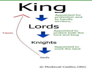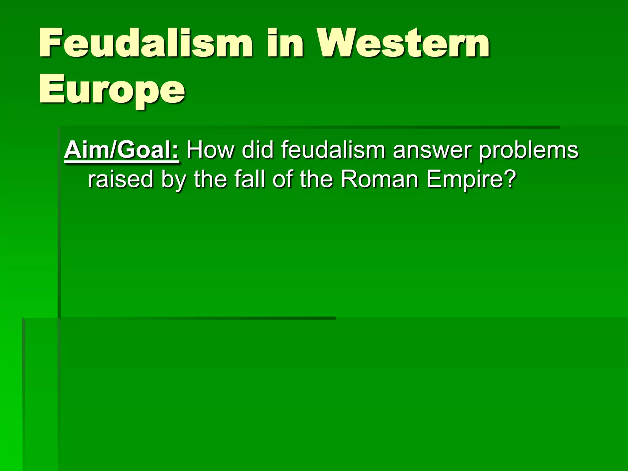 Feudalism developed in Western Europe following the fall of the Roman Empire to address the lack of a central governing authority. With the collapse of Rome, hundreds of independent kingdoms emerged to fill the power vacuum. Peasants, facing insecurity, offered their labor to landowning lords in exchange for military protection. This led to the rise of a feudal system where lords provided security and land to vassals who then owed military service back to their lords. At the bottom were serfs who were bound to the land and provided labor but had little freedom. Overall, feudalism established hierarchies of obligation and service to maintain order in the unstable early Middle Ages following Rome's decline.