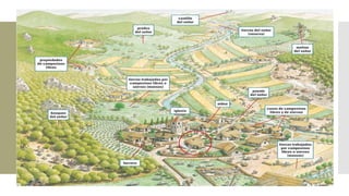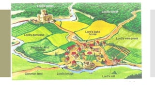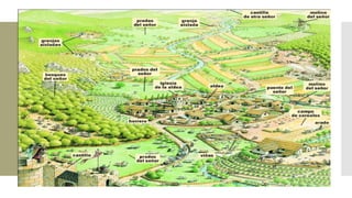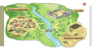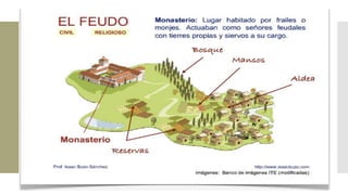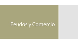 Feudos y Comercio discusses feudalism and medieval commerce. During the feudal period, society was organized into a strict hierarchy with lords controlling lands and peasants working them in exchange for protection. Trade between different regions grew under this system as merchants exchanged agricultural and craft goods. Over time, commerce expanded and cities developed, gradually weakening the feudal structure of medieval Europe.