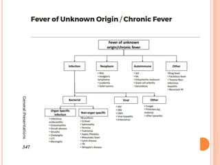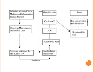 Fever is defined as a physiological condition characterized by elevated body temperature, typically over 98 to 100 degrees Fahrenheit, often associated with an underlying condition as the body works to fight off infection. There are various types of fever, including intermittent, remittent, hectic, continuous, and relapsing, with different patterns in temperature changes and potential causes ranging from infections to drug reactions. Treatment involves non-pharmacological approaches such as hydration and digestible foods, along with pharmacological methods like NSAIDs and acetaminophen for symptom relief.
