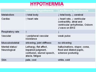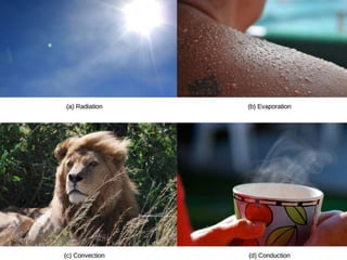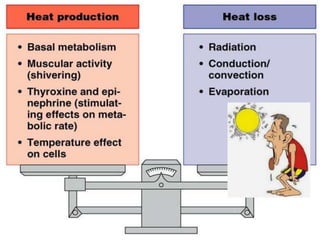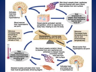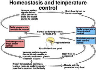 Thermoregulation is crucial for maintaining core body temperature around 37°C, with mechanisms like shivering and sweating responding to temperature fluctuations. The hypothalamus plays a central role in managing temperature homeostasis, responding to both peripheral and internal temperature stimuli. Body responses include vasodilation, increased sweating, and hormonal changes to either release or conserve heat based on the surrounding environment and activity level.
