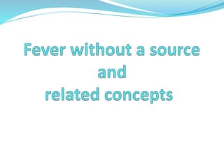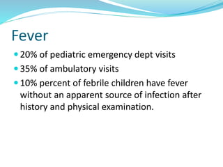Fever is a common reason for pediatric visits. The hypothalamus regulates body temperature and fever occurs when its set point is elevated. Fever without a source is difficult to diagnose and can be caused by infections, inflammatory disorders, or malignancies. Evaluation involves history, exam, labs including blood cultures, and imaging if indicated. Lower risk children based on criteria like Rochester may be managed as outpatients without antibiotics. Higher risk children receive empiric antibiotics targeting common pathogens until diagnosis is made. Antipyretics and antivirals are also used for symptom relief in some cases.