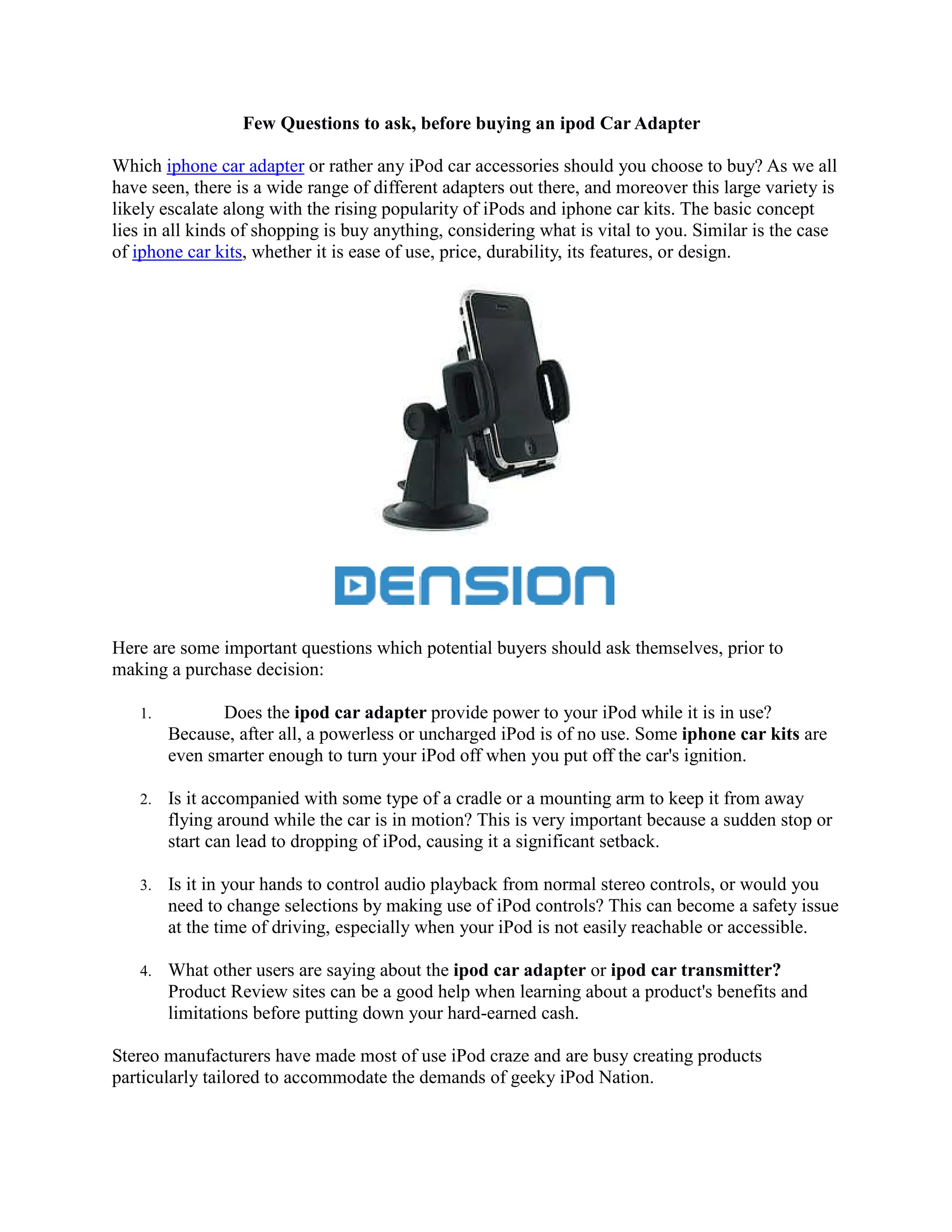 Which iphone car adapter or rather any iPod car accessories should you choose to buy? As we all have seen, there is a wide range of different adapters out there, and moreover this large variety is likely escalate along with the rising popularity of iPods and iphone car kits.