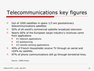 Satellites play a key role in telecommunications and many applications in everyday life. Over 1/3 of satellites are used for telecommunications and nearly 66% of European space industry revenues come from telecom applications. Satellites enable applications like telemedicine to monitor diabetics, precision agriculture using GPS, and construction projects using GPS for assembly. New trends include integrating satellite navigation into vehicles and triple play packages combining internet, phone and TV.