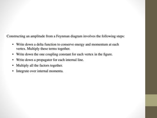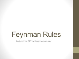 This document summarizes a lecture on Feynman rules for quantum field theory. The lecture introduces perturbation theory and elementary Feynman rules for calculating amplitudes. It discusses the interaction picture and S-matrix approach. Examples are provided for calculating amplitudes and probabilities for basic processes, including decay rates and lifetimes. The goal is to explain the fundamental concepts and tools used in quantum field theory calculations.