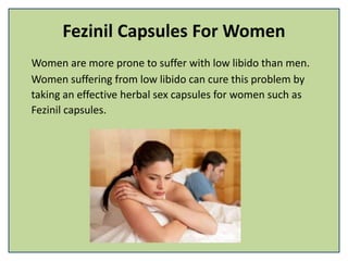Fezinil capsules are an herbal supplement designed to increase female libido and sexual desire. The capsules contain herbs and nutrients that balance hormones and boost libido by stimulating the nervous system and reproductive organs. Taking Fezinil can increase a woman's interest in sex, heighten sensation during intimacy, and provide more energy and arousal. It aims to reinstate a woman's natural desire and nourish her genitalia for long lasting effects by addressing symptoms of low libido like lack of interest, thoughts, initiation, and pleasure from sex.