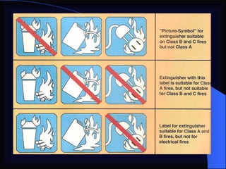 1. The document provides an overview of fire safety training, including definitions of fire, fire classifications, fire extinguishers, and emergency response procedures.