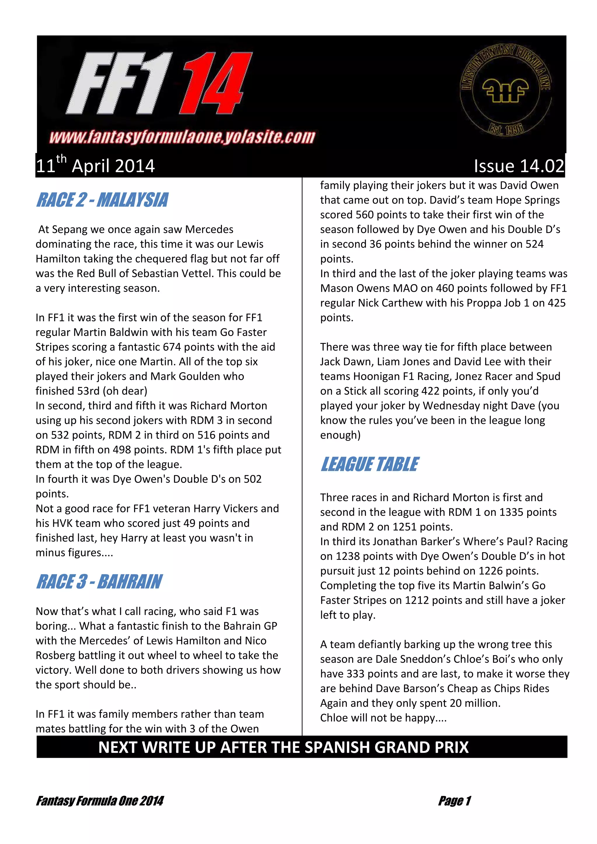 - In the Fantasy Formula One league, Martin Baldwin won with his team Go Faster Stripes, scoring 674 points with the help of playing his joker. Richard Morton finished in second, third and fifth with his various RDM teams.