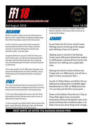 Lewis Whiting returns to the top of the league table with Whiting's Flyers on 5172 points. Mick Brown's Roaring Forties team is in second place, 294 points behind on 4878 points. Nick Carthew and Proppa Job 1 move into third place on 4854 points and still have a joker remaining. Philip Wilson and Willy's Prix are in fourth place on 4850 points. Mick Brown's Middle Aged Skateboarders remain in fifth place on 4848 points.