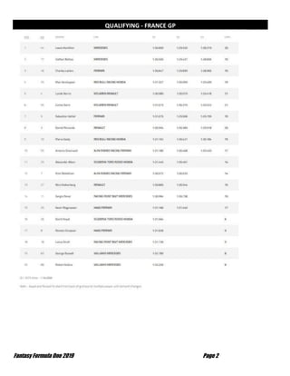 The document provides summaries of the recent Fantasy Formula One (FF1) league races and standings. For the French Grand Prix, James Griffiths' Racing Bean team scored the most points (652) while Mick Brown's Stone Cold Sauber was in fourth place with 369 points. In the overall league standings after France, Richard Morton's Rubber Racing 1 leads with 3555 points, followed by Mick Brown's Stone Cold Sauber in second with 3534 points. Callum Lee's CL Losers remains in last place with 2180 points.