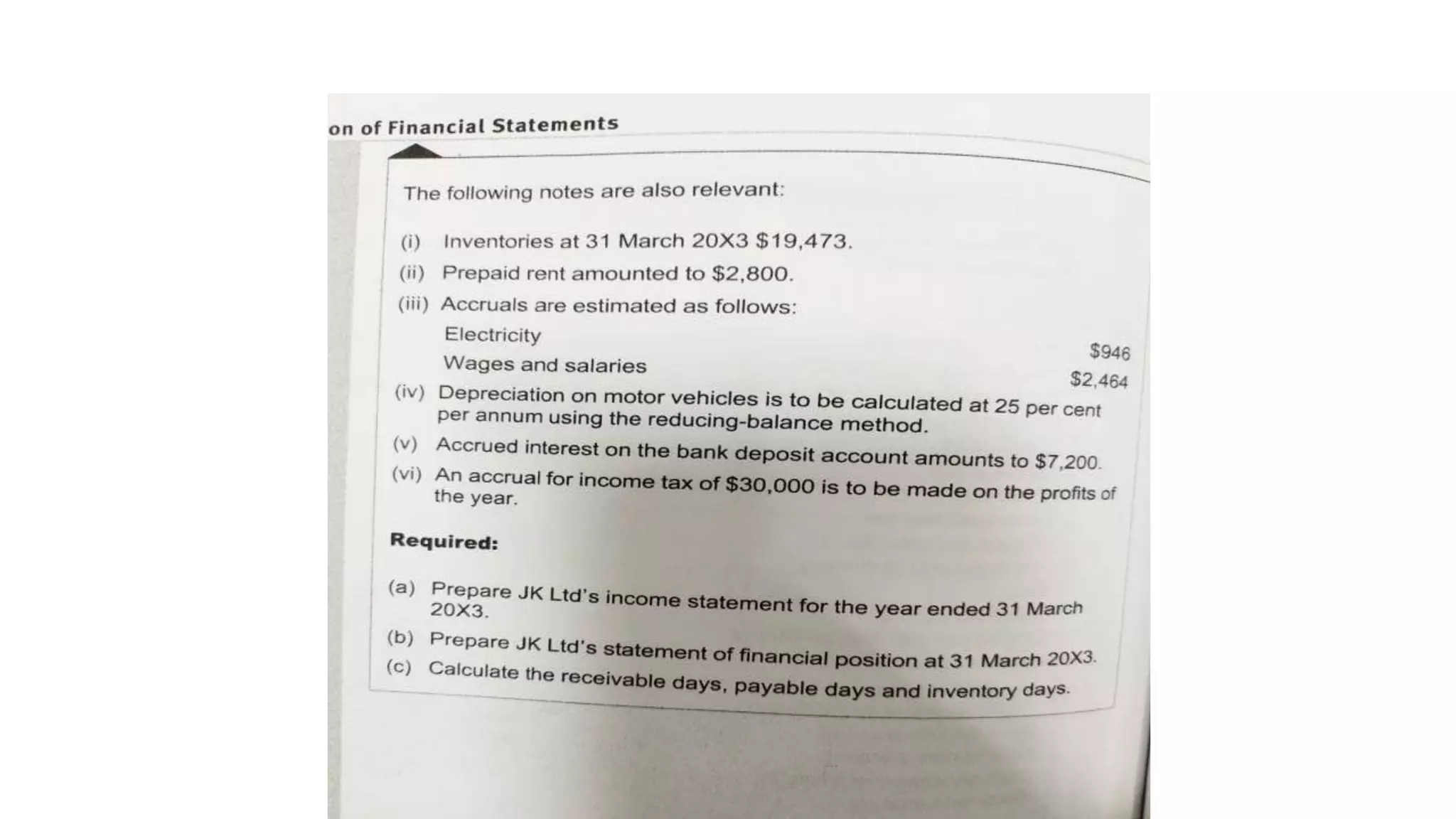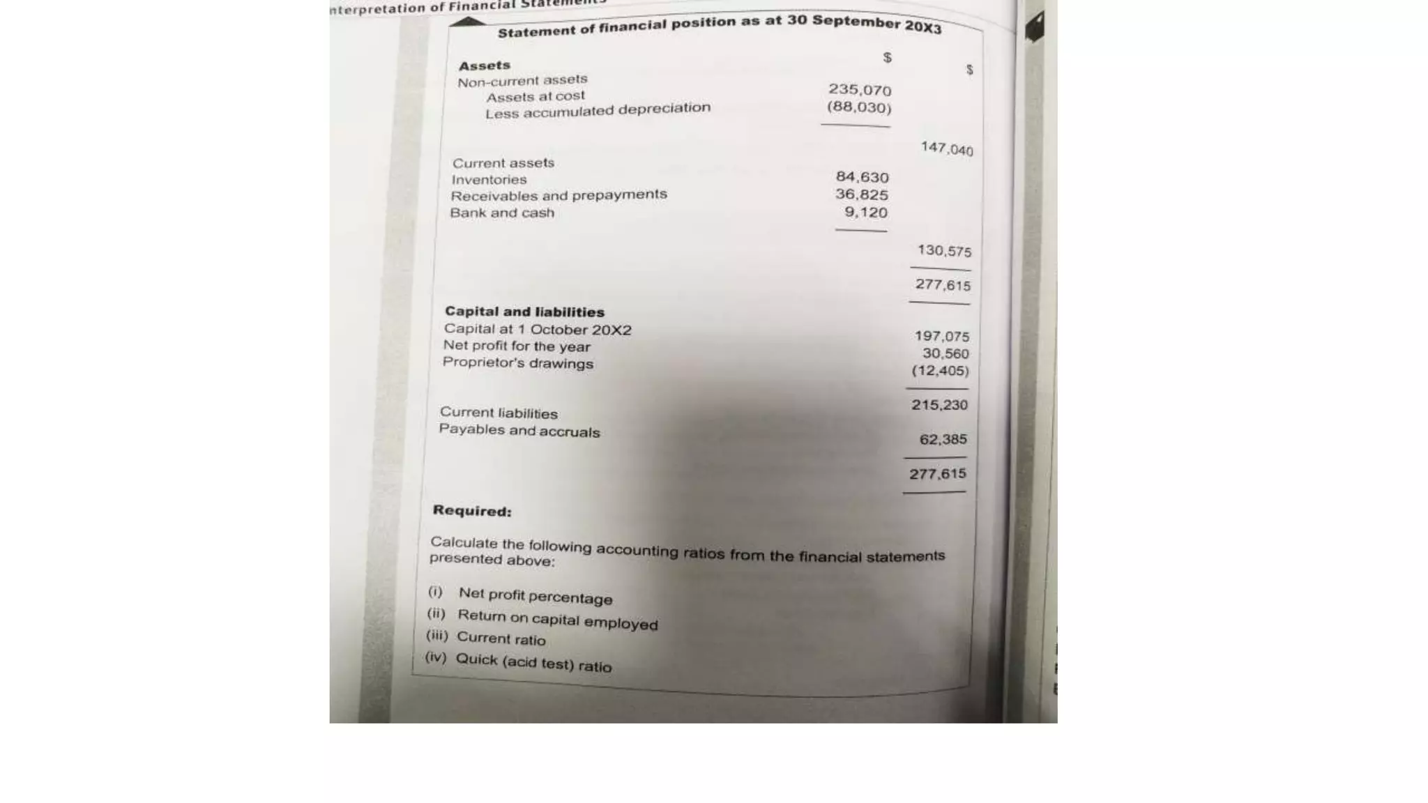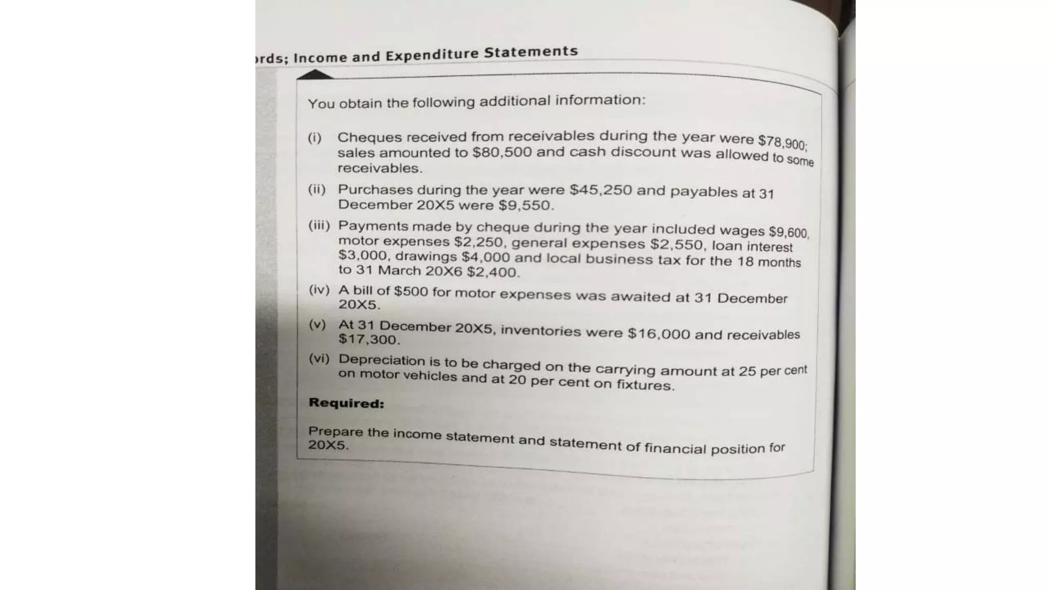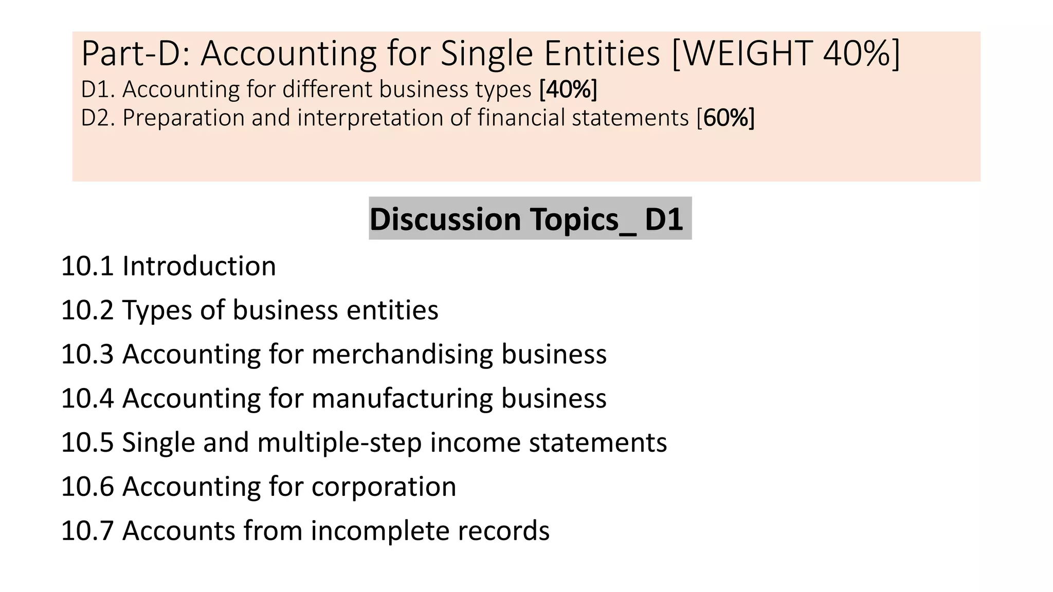 The document provides an overview of accounting for single entities, including different types of business entities and how to account for merchandising and manufacturing businesses. It discusses accounting for corporations and accounting from incomplete records. It also covers the preparation and interpretation of key financial statements, including the statement of financial position, income statement, statement of changes in equity, and statement of cash flows. Key accounting concepts like the accrual basis of accounting and materiality are also summarized.