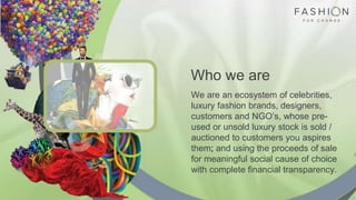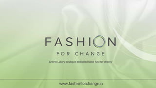 Fashion for Change India is an online luxury boutique that sells pre-owned or unsold luxury fashion items from celebrities, brands, and designers. It aims to raise funds for charity by auctioning and selling these items to customers and donating most of the proceeds to social causes in a financially transparent manner. It connects celebrities, luxury brands, customers, and NGOs to promote charity through the reuse of luxury fashion items.